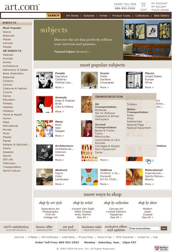 - Hovering over the "more" link displays a layer revealing a low-commitment way to see more subcategories.